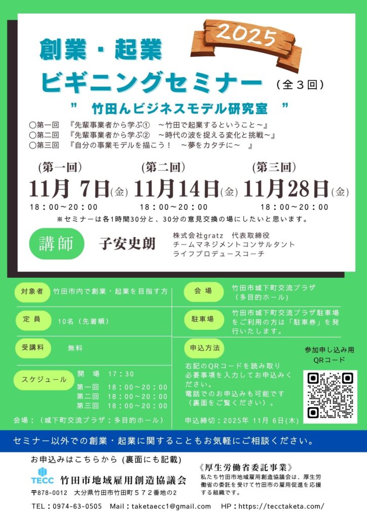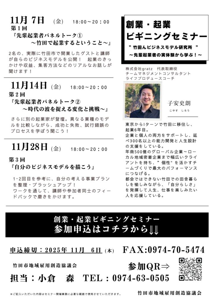実際に竹田市で起業したゲスト講師の体験談を聞き、創業の流れや心構えを学びます。 - 第2回:11月14日(金)18:00~20:00