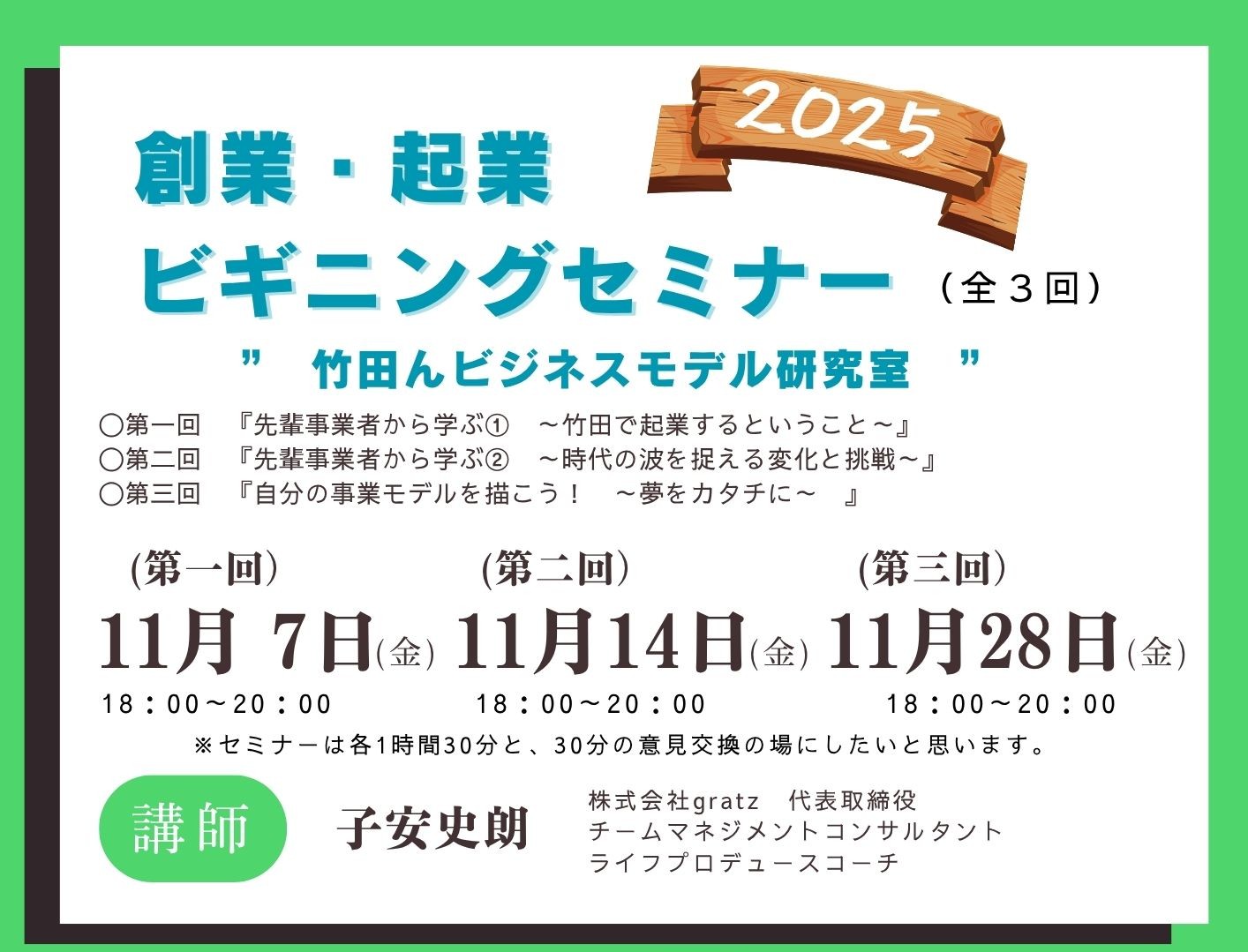 実際に竹田市で起業したゲスト講師の体験談を聞き、創業の流れや心構えを学びます。 - 第2回:11月14日(金)18:00~20:00