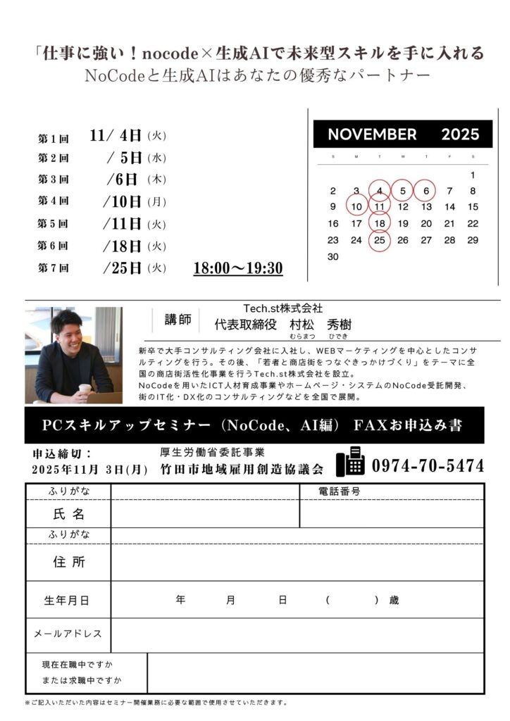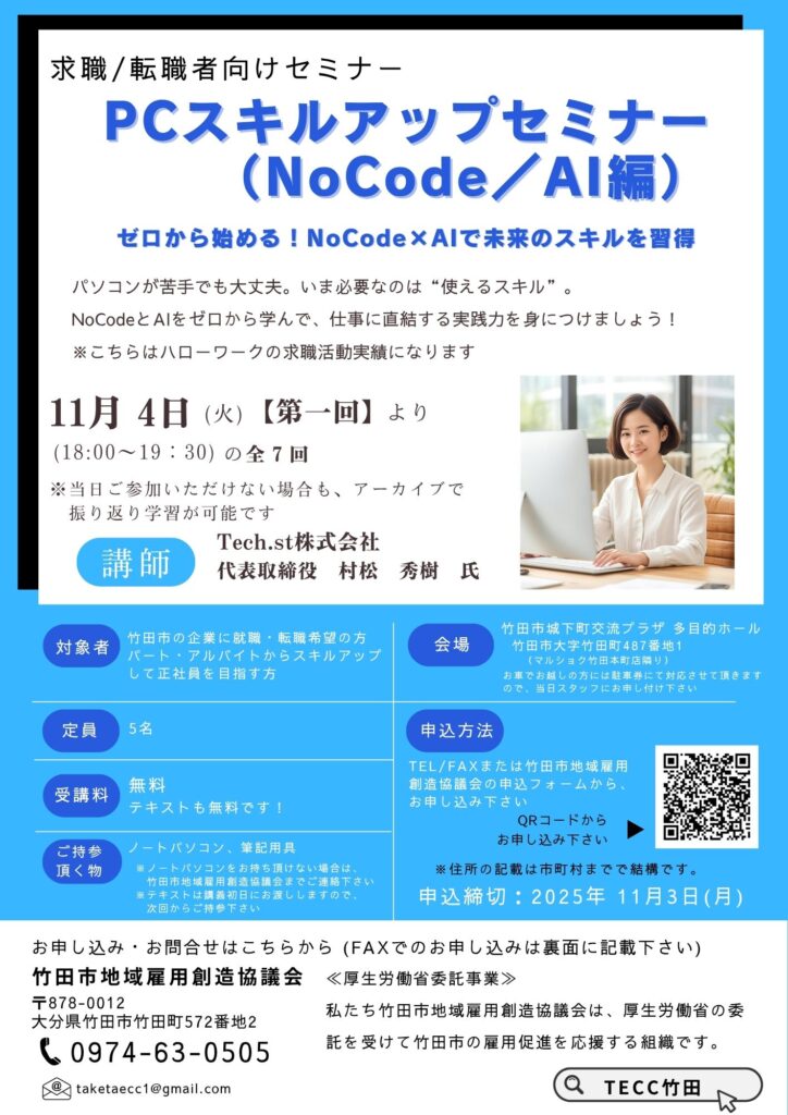 竹田市の企業への就職・転職を目指す方を対象に、「PCスキルアップセミナー(NoCode編)」を開催します。