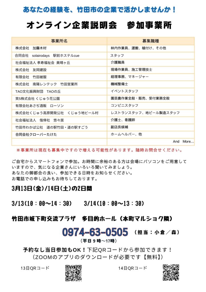 ※オンラインにてご参加の方にはZOOMのURLをお送りします - 対象:竹田市の企業に就職希望の求職者の方(竹田市に移住ご希望の方も歓迎です)