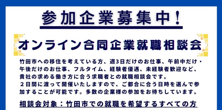 ※オンラインにてご参加の方にはZOOMのURLをお送りします - 対象:竹田市の企業に就職希望の求職者の方(竹田市に移住ご希望の方も歓迎です)